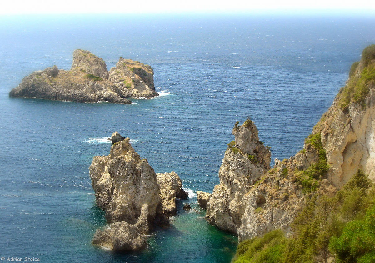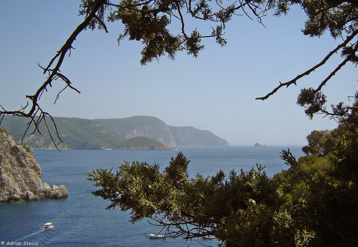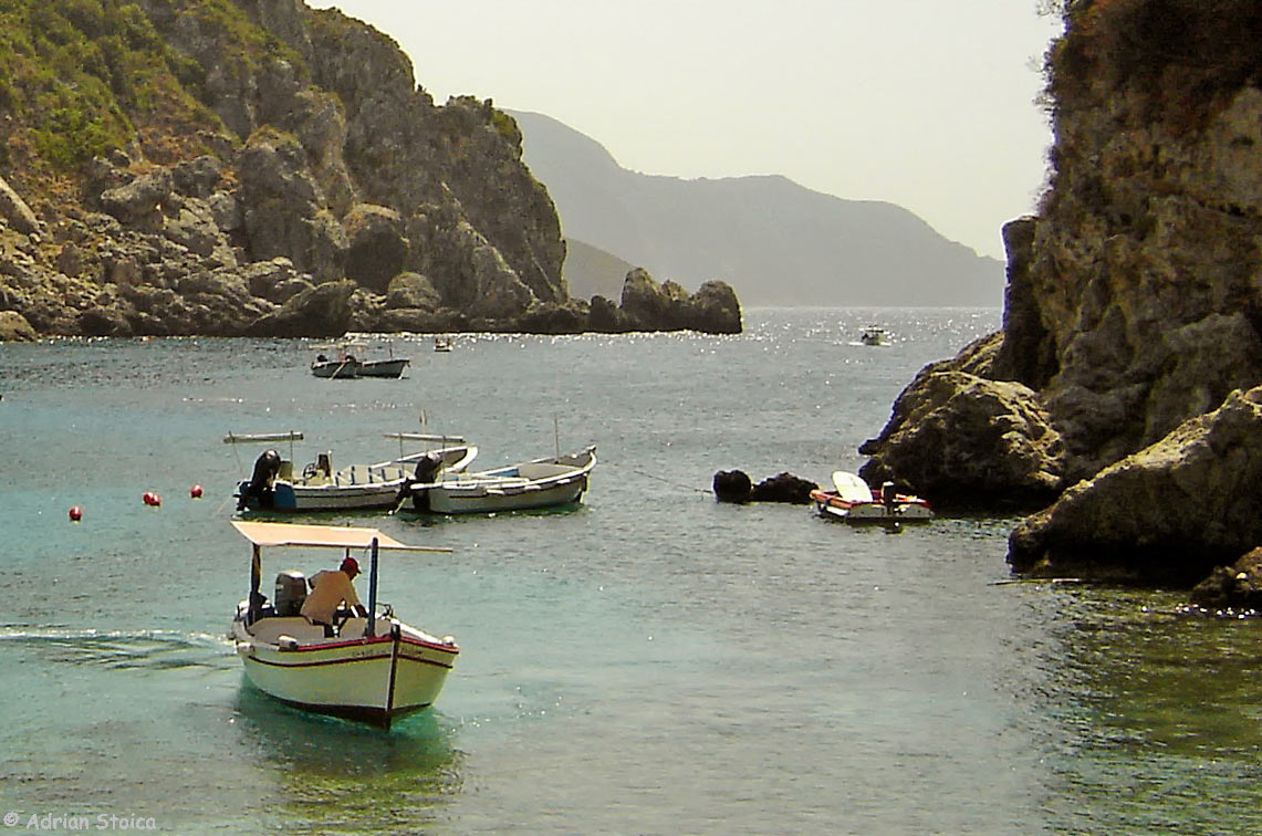 In luna lui august, cand ne-am nimerit noi prin Corfu, canicula era in toi. Vreo 38 de grade la umbra (daca gaseai) si fara pic de vant. Una peste alta si marea parca se pregatea sa fiarba – la 28 de grade in apa, greu mai reuseai sa te racoresti. Fara sa stim prea multe despre imprejurimi (doar ce ne povestise ghida) am pornit spre Paleokastritsa, dupa modelul mai sus amintit. Autobuz din Benitses pana in Kerkyra, cate sute de metri la pas si sus in Greenbus. Dupa cateva zeci de minute eram in Paleokastritsa. Acolo unde ne-a lasat autobuzul, incepea plaja, Doua erau mai exact, una, ingusta si cu pietris, celalalta, parte a zonei destinate sporturilor acvatice. Ei bine, aici nu recomand sa veniti cu copii mici. In maxim doi metri, apa trece de un stat de om. Si e rece. Cred ca atunci, in miez de canicula, nu depasea 21 de grade. Vederea insa, este de neratat. Golfulete inconjurate de stanci, insulite la care poti ajunge cu water taxi pentru doar cativa euro si poti zabovi impreuna cu ai tai, nestingherit de alti turisti, pana la ora convenita cu „taximetristul”pentru intoarcere.