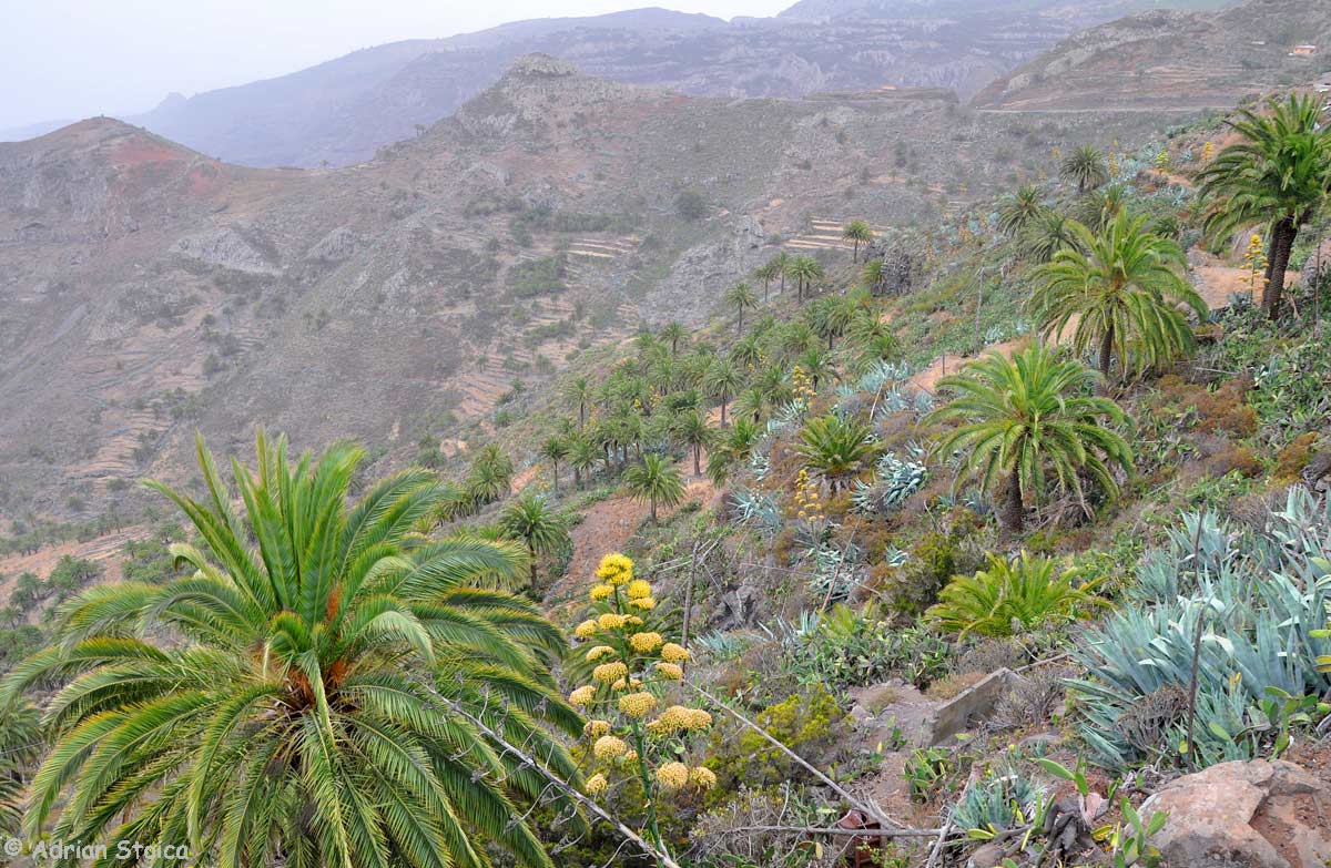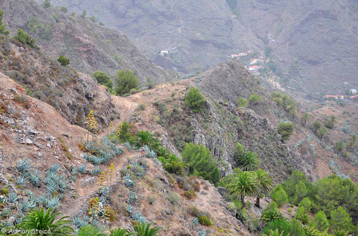 Mai departe, ne preia autocarul. Locul meu e la geam, asa ca pot face fotografii. Ghidul vorbeste despre locurile unde ajungem, dar nu spune aproape nimic despre cele pe care urmeaza sa le vizitam. Nici pliantul de la agentie nu ofera informatii detaliate, dar n-are importanta. Am aflat de pe google care sunt obiectivele principale. Autocarul trage greu la urcare. In stanga, pe pantele abrupte, rasar palmieri, in grupuri mici, razlete. Pete de culoare in peisajul cenusiu si stancos. Cerul etaleaza diverse nuante de gri, iar vizibilitatea e in continuare redusa. Imi amintesc pozele cu cer albastru intens si culorile aprinse ale vegetatiei. Oprim dupa vreun sfert de ora. O carare serpuieste adanc, spre valea inecata in pacla. Insula e celebra pentru traseele de hiking si multi turisti vin aici special pentru asta. Casele din vale se zaresc cu greu. Poate ca pana la oprirea urmatoare apare si soarele.