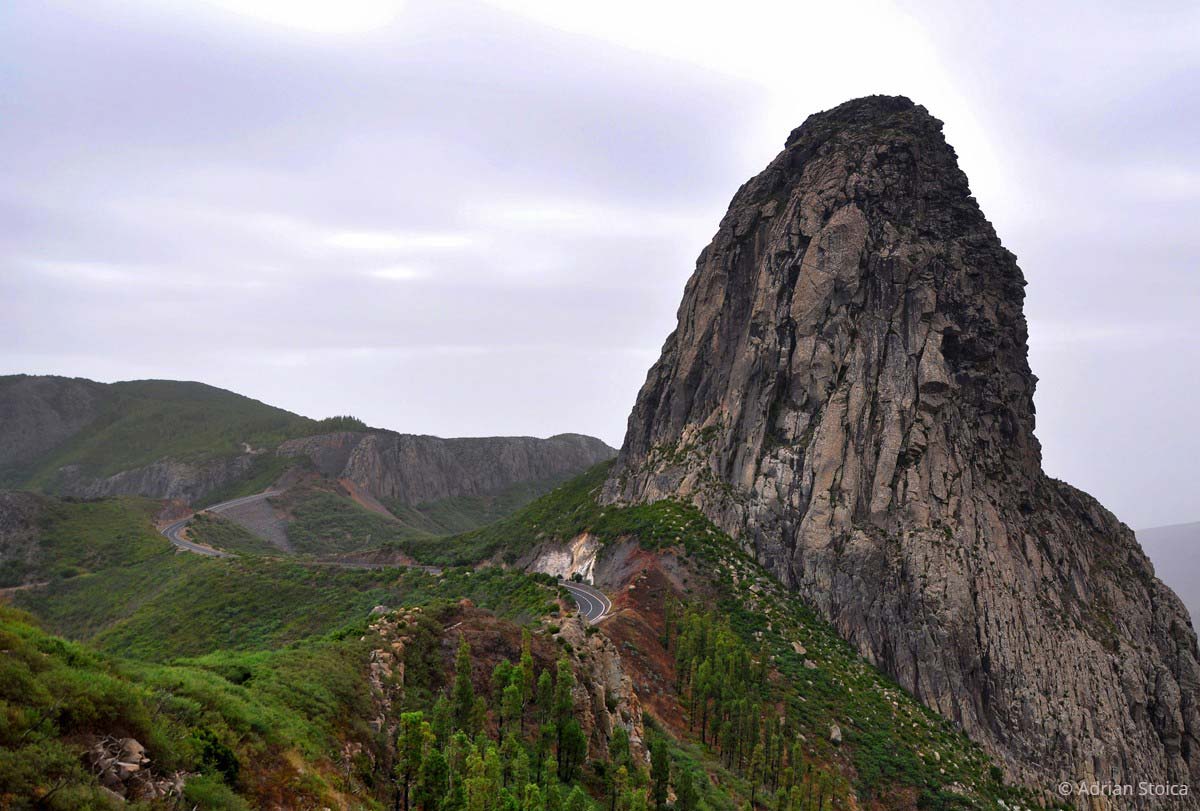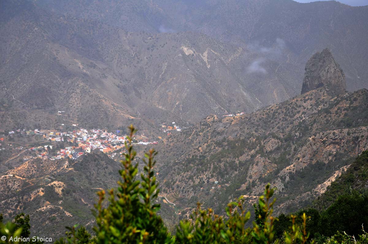 Urmatoarea oprire o facem la Mirador Roque de Agando. Numele vine de la stanca inaltata, ca un urias impietrit, intre vaile La Laja si Benchijigua. Suntem in parcul national Garajonay, numit astfel la infiintare, in 1981, dupa cel mai inalt varf al insulei, Alto de Garajonay (1487m inaltime).